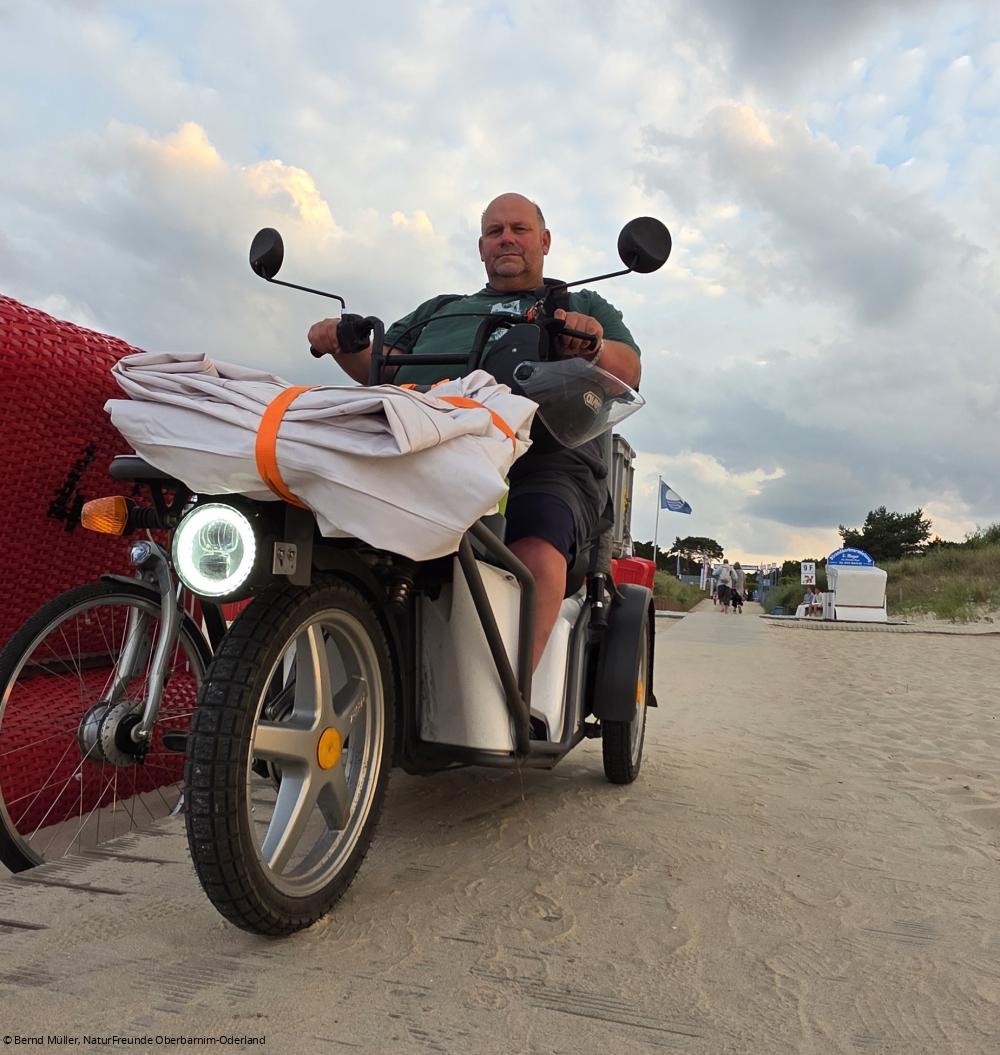 Bernd Müller kennt es selbst. Als er vor 10 Jahren keinen Schritt mehr ohne Hilfsmittel machen konnte, bekam er starke Angststörungen und konnte seine Wohnung nicht mehr verlassen. Es brauchte Jahre, bis er seine Ängste überwinden konnte und die Störung in den Griff bekam. Er wollte einmal zur Ostsee mit dem Fahrrad. Diesen Traum hat er sich zumindest teilweise zusammen mit seinem Sohn nun erfüllt. Es ist ein völlig anderes Gefühl in der Natur und bei den Menschen zu sein.