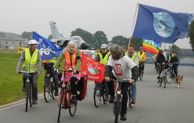 Zu einer antimilitaristischen Fahrradtour um den Fliegerhorst Schleswig bei Jagel in Schleswig-Holstein hatte der Landesverband Hamburg / Schleswig-Holstein der Deutschen Friedensgesellschaft – Vereinigte KriegsdienstgegnerInnen (DFG-VK) eingeladen. Trotz Wind und Regen umrundeten 15 Aktive von den NaturFreunden, ATTAC, FIfF und DFG-VK das Bundeswehrareal auf einer knapp 30 Kilometer langen Fahrt.