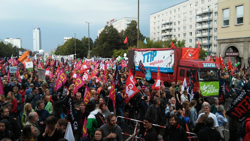 Bundesweit 320.000 Menschen haben am 17. September in sieben deutschen Städten gegen die Freihandelsabkommen CETA und TTIP demonstriert. In Berlin demonstrierten 70.000 Menschen, in Hamburg waren es 65.000, in Köln 55.000, in Frankfurt 50.000, in Leipzig 15.000, in Stuttgart 40.000 und in München 25.000. Die Erwartungen der Organisatoren, zu denen auch die NaturFreunde Deutschlands gehören, wurden damit deutlich übertroffen.