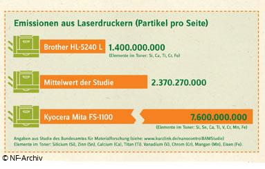 Laserdrucker, die heute in jedem Büro stehen, wirbeln in zehn Minuten bis zu einer Billion Nanopartikel in die Raumluft. Das ist eine Eins mit zwölf Nullen oder anders ausgedrückt: tausend Milliarden Teilchen. Im Büro tätige Menschen atmen pro Stunde davon mehr als 7,5 Millionen Partikel ein.