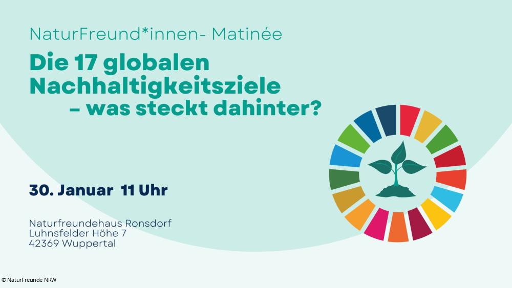 Doch was steckt hinter diesen 17 Nachhaltigkeitszielen? Was haben sie mit uns und unserem Engagement zu tun? Und wie können wir uns für die Umsetzung der Ziele in Wuppertal einsetzen? Zum Austausch über diese und weitere spannende Fragen rund um die Nachhaltigkeitsziele und deren Verwirklichung in der Stadt Wuppertal laden die NaturFreunde Wuppertal am 30. Januar um 11 Uhr ein.