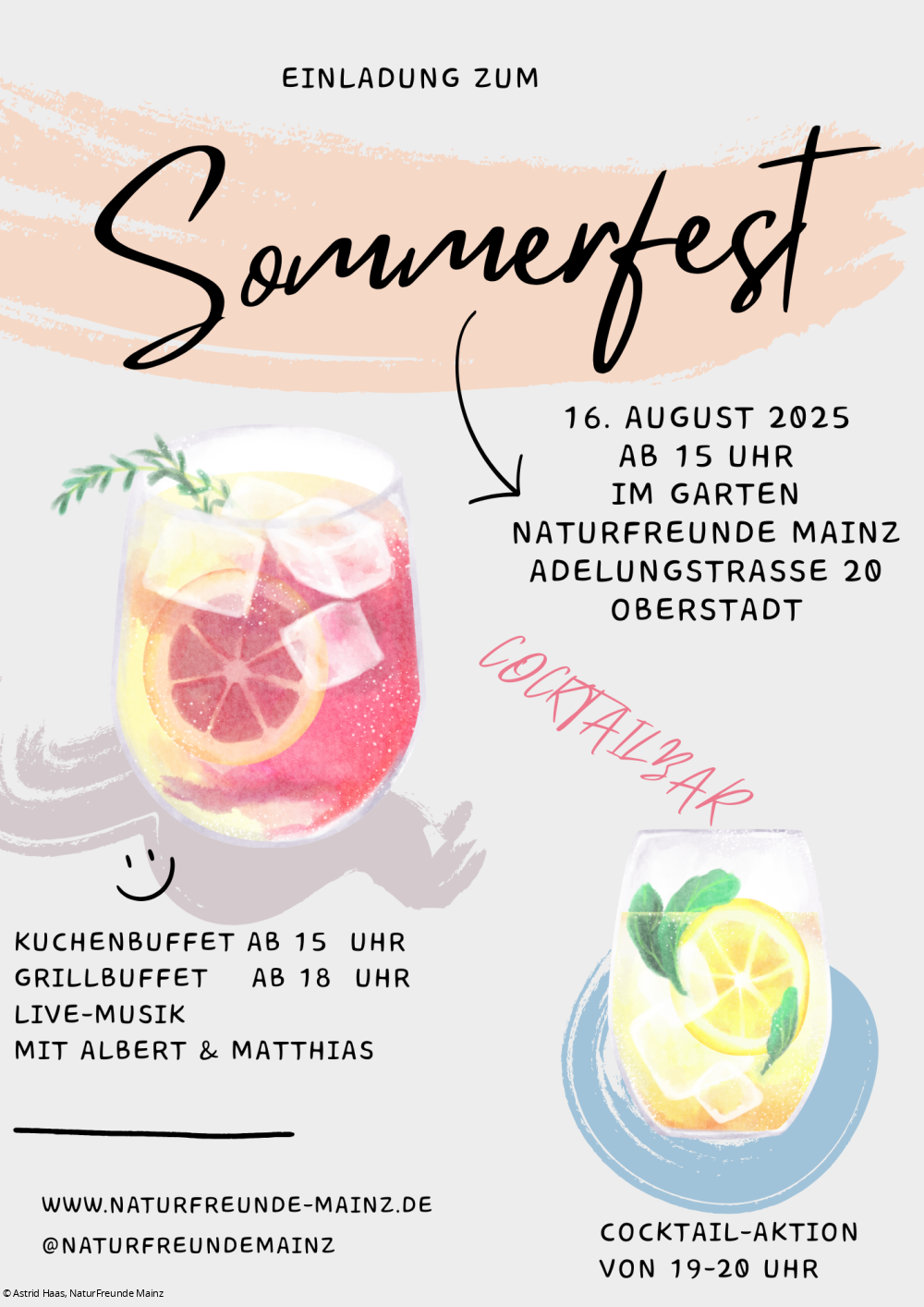 Die Mainzer NaturFreunde sind seit 30 Jahren in ihrem Vereinsheim, mitten in einem Gebäudekomplex einer Wohnungsgenossenschaft in der Mainzer Oberstadt. Unser diesjähriges Sommerfest ist deshalb eine kleine Jubiläumsfeier und wir freuen uns, neben unserem neu gestalteten begrünten Platz vor dem Vereinsheim im Garten mit Benjeshecke und Hochstaudenbeet zu Kaffee, Kuchen und Cocktails einladen zu dürfen. Unser musikalisches Duo Albert und Matthias spielt eine Mischung aus verschiedenen Liedergenres, die auch zum Mitsingen geeignet ist.