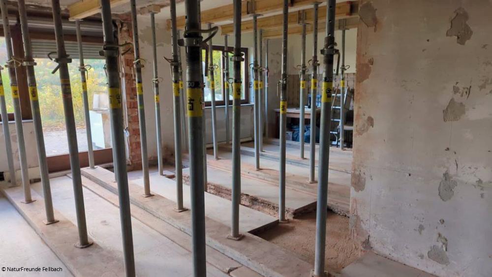 Die Roh- und Trockenbauarbeiten übernahmen dann aber qualifizierte Handwerker. Diese Arbeiten umfassten unter anderem die Entfernung der Wand zwischen dem Jugendraum und der Selbstversorgerküche. Ein Statiker, der seine Expertise übrigens auch in Eigenleistung zur Verfügung stellte, beobachtete die Abbrucharbeiten. Dabei stellte er leider fest, dass die geplante Sicherung der Decke bis zum Einbau der Stahlträger nicht ausreichen würde. Tatsächlich musste letztlich der gesamte Raum abgestützt werden.